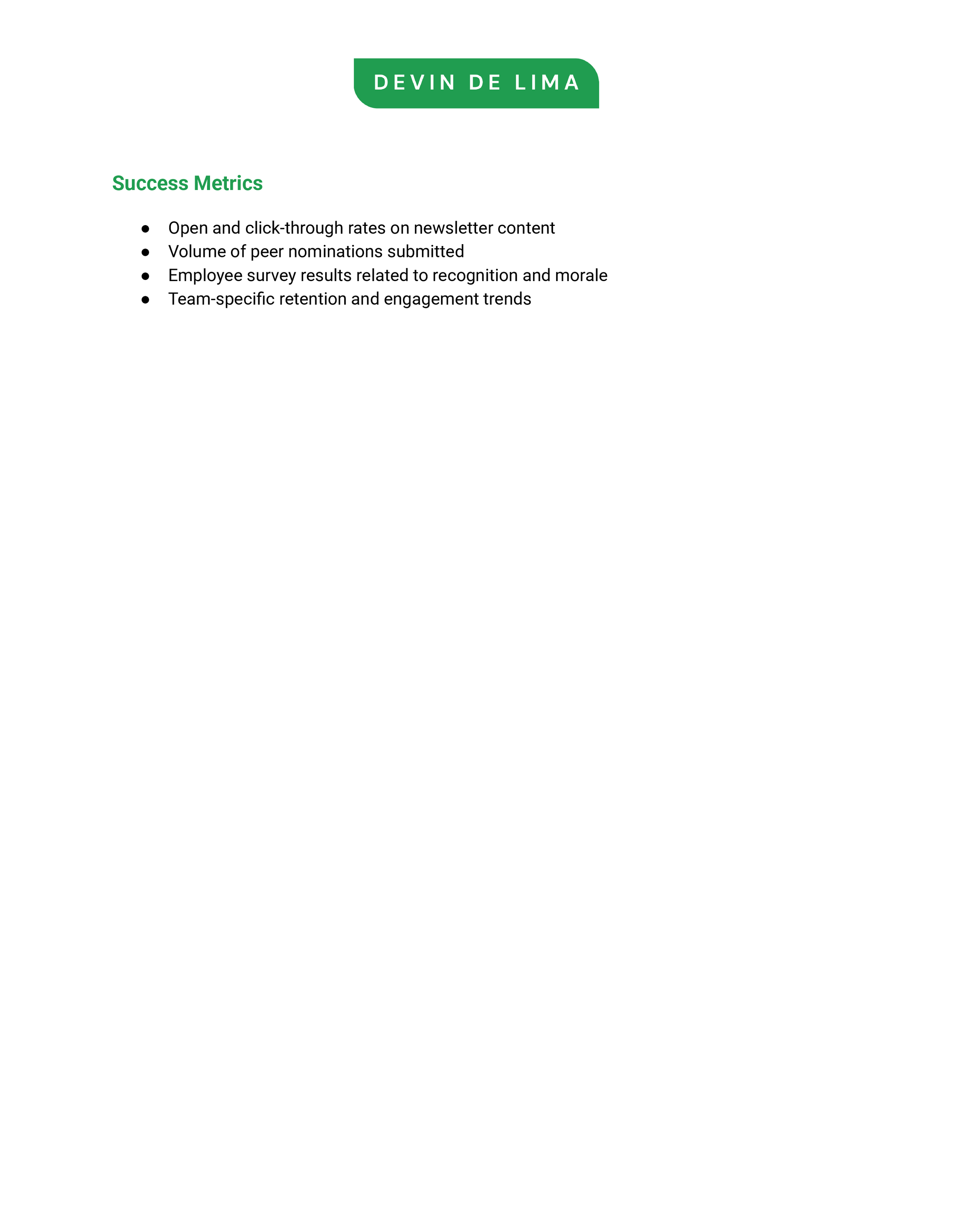 e-mail, newsletters, and all-staff meetings, and measurable success metrics. The strategy emphasizes visibility, inclusion, and cultural alignment—highlighting my ability to drive morale and connection through thoughtful, people-centered communication.