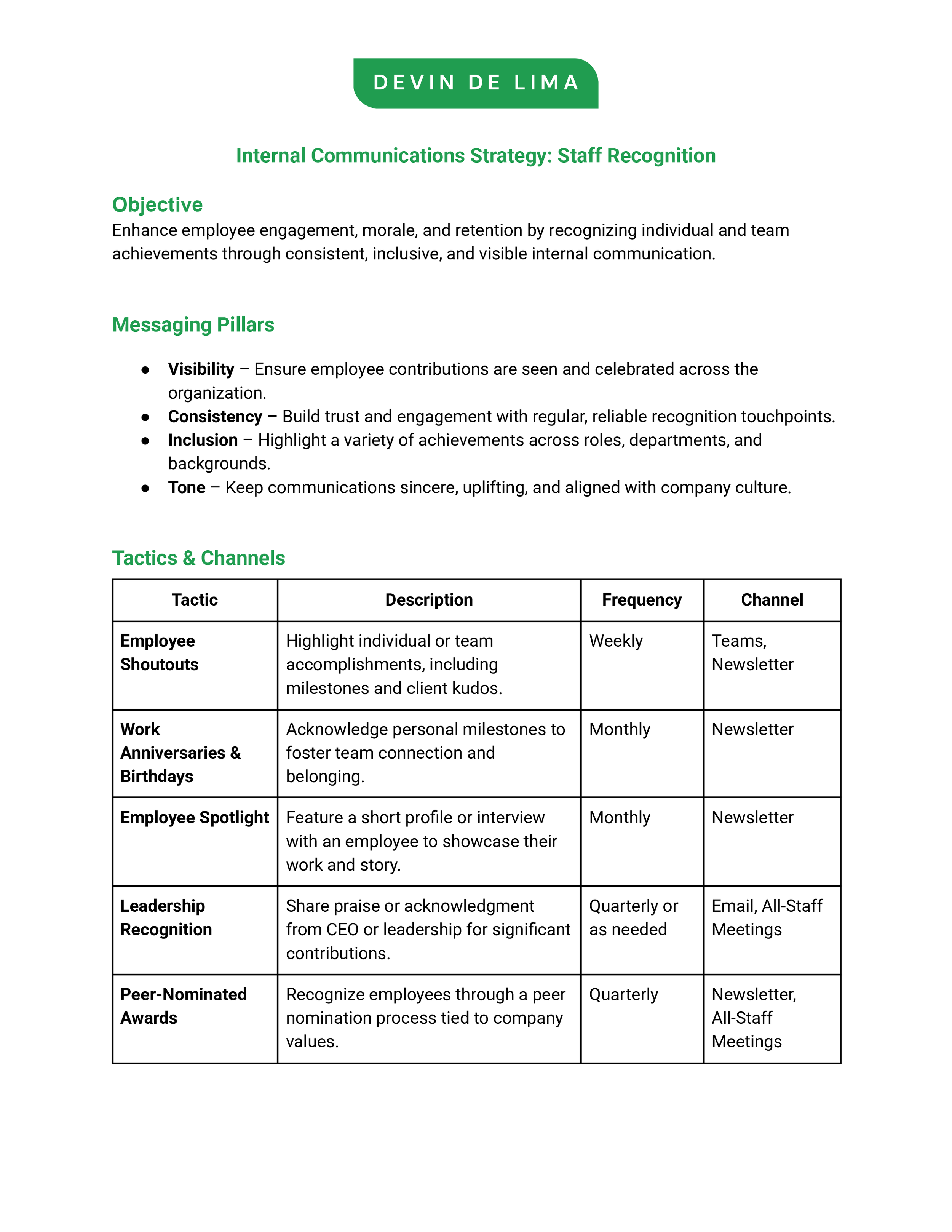 I outlined a strategy for a clear, effective internal communications plan designed to boost employee engagement through consistent recognition of staff achievements. It includes key messaging pillars, communication tactics across Microsoft Teams,